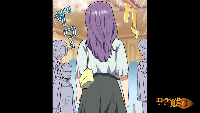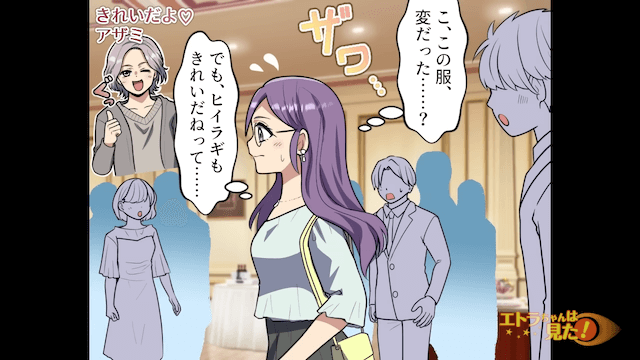 同窓会当日、勇気を出して会場に入った主人公。 するとなぜか周囲から視線を向けられ、主人公は「この服、変だった?」と戸惑います。
