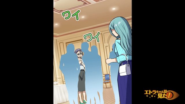 主人公の夫が大企業の御曹司であることを知っていた友人は、大はしゃぎで主人公に話しかけてきました。 すると周囲の同級生たちも話しかけてきて、主人公は会場で人気者になります。