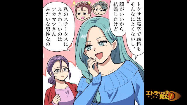 同級生に考え直してもらうため、慌てて同級生宅へ行った主人公。 しかし同級生は「私のステータスにふさわしいのは彼みたいな男性なの」と言い、一切考え直してくれません。