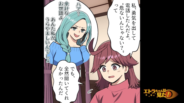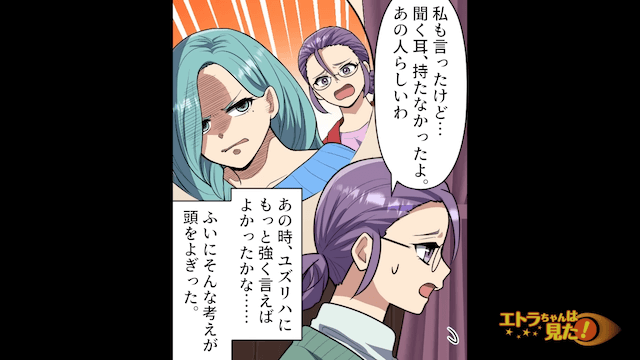 同級生が結婚詐欺に遭って夫と離婚裁判中であることを友人から聞いた主人公。 そして主人公は自分と張り合おうとしていた同級生の顔を思い出し「きっと彼女は勝ち負けの呪縛から抜け出せないのね…」と悲しい気持ちになったのでした。