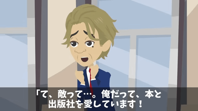 食堂の女性は、主人公の足を引っ張る部長は自分の敵だと言います。 それに対し部長は「俺だって、本と出版社を愛しています!」と言いますが…。