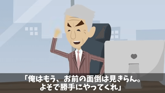 社長は「俺はもう、お前の面倒は見きれない。よそで勝手にやってくれ」と言いました。 それを聞いた部長は「そ…そんなあああ!」と絶望します。