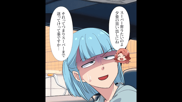「早く断ったほうがいいよ」と友人に忠告され、翌日の送迎を最後に断ることにした主人公。 しかし翌日、ママ友の子の送迎に加え、ママ友のスーパーへの送迎も頼まれてしまい、主人公は唖然とします。