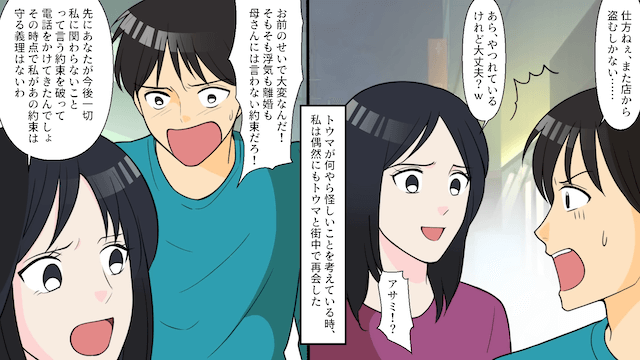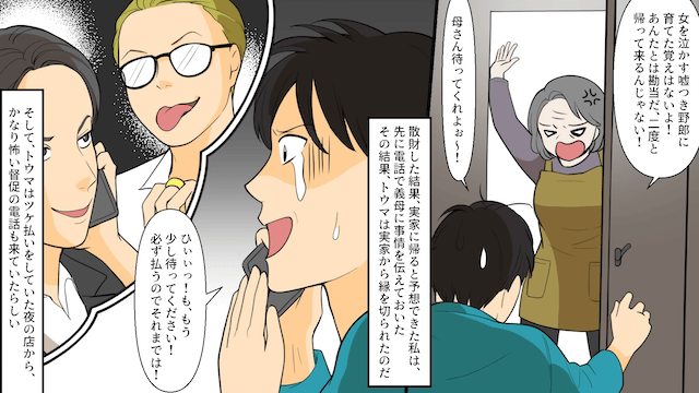 今回は『元夫「500万円はいつ振り込むんだ!」私「払わないけど?」⇒勘違いした夫の末路』を紹介します。 主人公からお金を巻き上げようとしていたことが義母にバレてしまい、問い詰められる元夫。 さらに浮気が原因で離婚したことも知られ、元夫は義母に激怒されるのでした。