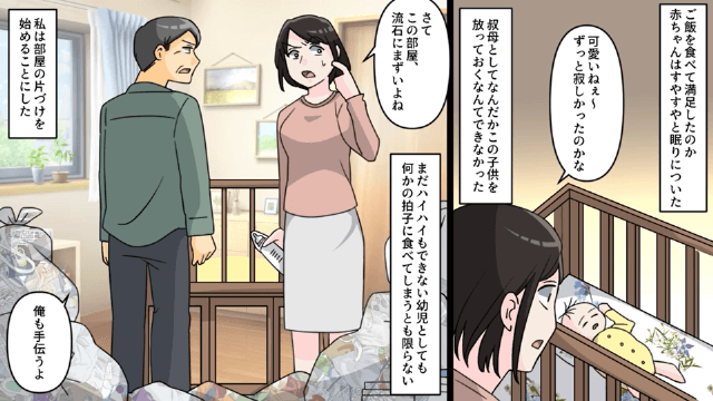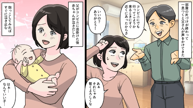 主人公と父は泣き出してしまった子どもにミルクをあげたり、いやに散らかっている部屋を兄夫婦の代わりに片づけたりしていました。 そして子どもが泣き止んだ直後、コンビニへ行こうとしていた父が主人公に「急いで乗れ!今すぐ出るぞ!」と慌てた様子で言ってきたのです。