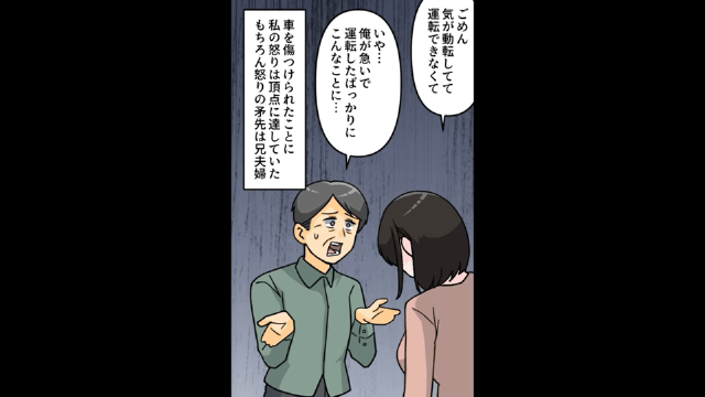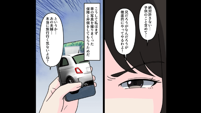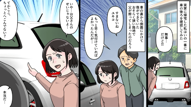今回は『兄に新婚祝いを渡しにいくと…父「今すぐ逃げるぞ!」私「へ?」』を紹介します。 見守りカメラで様子を見ていた兄夫婦は、普段懐いていない子どもが主人公に懐いていたことや、主人公が掃除をしたことで子どもを置いての旅行計画がバレたかもしれないことに腹を立てていました。 そして主人公は父と一緒に逃げる途中、兄夫婦が車にイタズラなどをしていないか気になって…。
