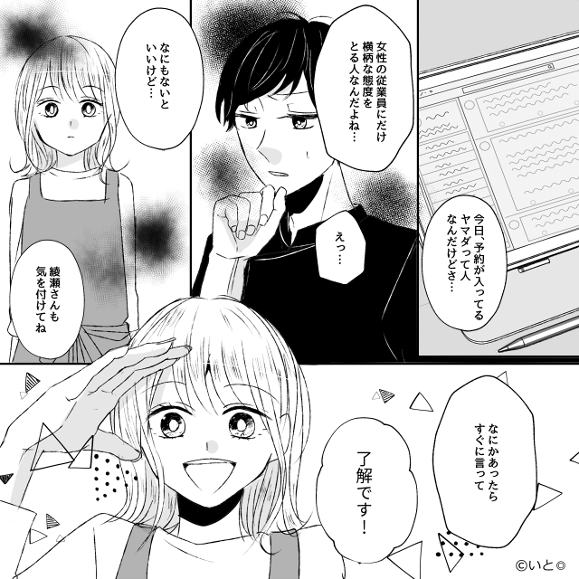 明るい女性店員に協力してもらったこともあり、主人公が始めた飲食店は毎日大繁盛。 そんなある日、女性にだけ横柄な態度をとる男性客が来店して…。