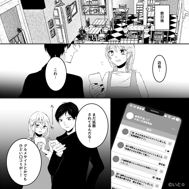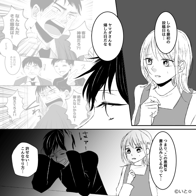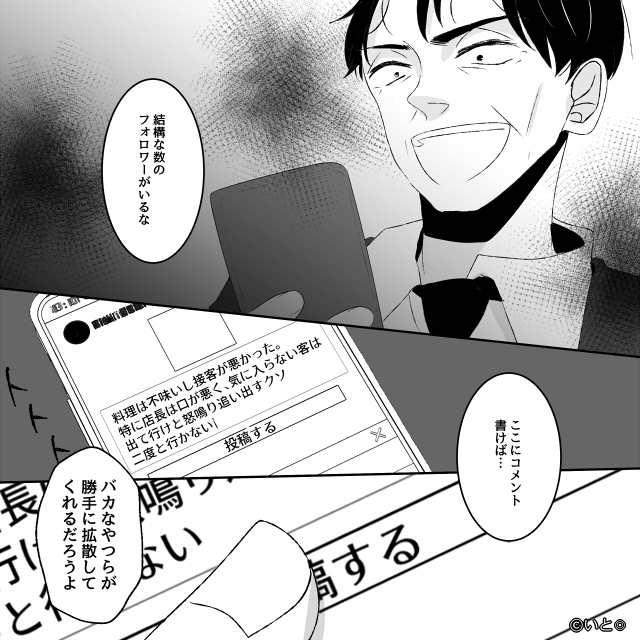 今回は『横柄な客を出禁にしたら、客足が遠のいたワケ』を紹介します。 主人公に出入り禁止を言い渡されて激怒し、仕返しを考えた男性客。 口コミサイトを見つけ「これは使えるかもな」とつぶやいたのでした。