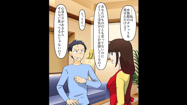 夫の言動に違和感を抱いていたある日、夫のポケットから水族館のペアチケットが出てきたため、夫を問い詰める主人公。 すると夫は開き直り、浮気を認めて「俺がこんなことをした原因はお前にもあるんだぞ!?」と主人公に責任を押しつけてきたのでした。