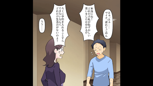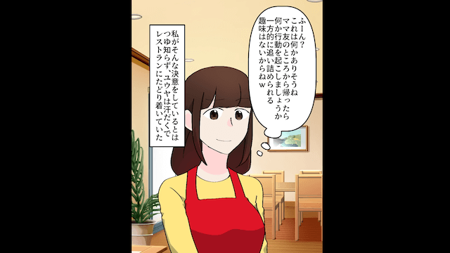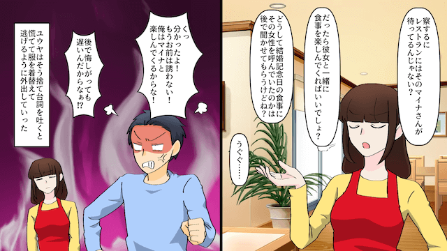 結婚記念日の前日、夫が予約日を間違えていたせいで、1人でレストランを訪れた浮気相手。 浮気相手は夫を責め、夫は慌てて主人公を誘ってレストランに向かおうとするのですが…。