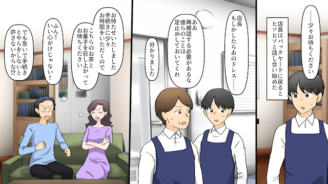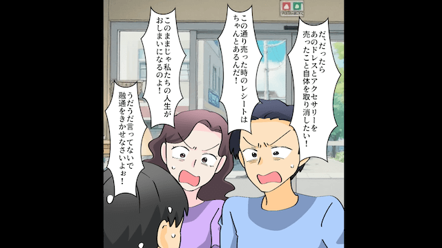 今回は『夫「結婚記念日に悪いが離婚してくれ」私「いいわよ?」快諾した結果』を紹介します。 売却したものを買い戻そうとして、店員に詰め寄る夫。 しかし買取金額より売値のほうが高かったため、お金が足りず…。