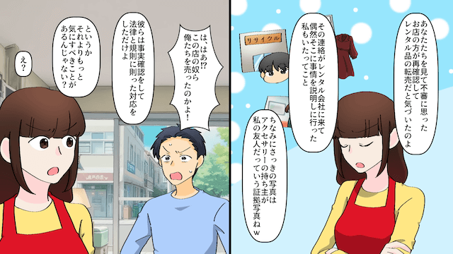 必死に買い戻そうとしている夫と浮気相手を見て不信感を抱いた店員は、売却されたものを再確認しました。 その結果、窃盗品であることが明らかになり、店員は主人公と警察を呼びます。