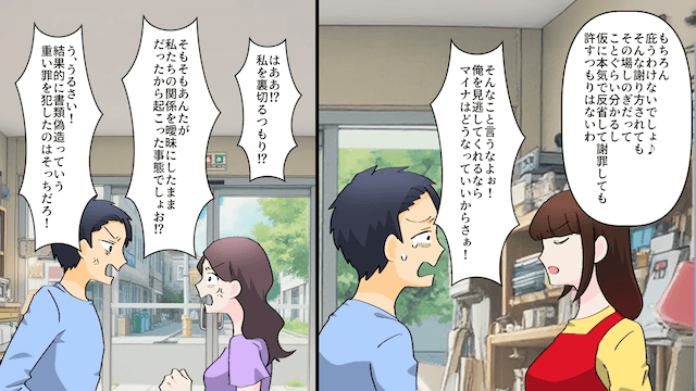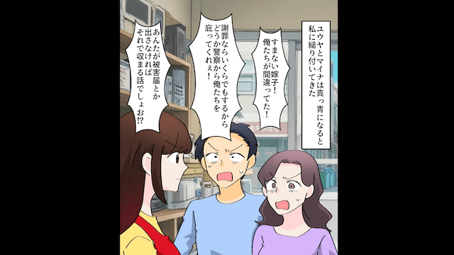 警察を呼ばれて焦った夫と浮気相手は主人公にすがりますが、主人公が許すはずもなく…。