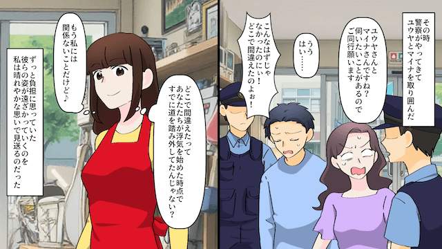 今回は『夫「結婚記念日に悪いが離婚してくれ」私「いいわよ?」快諾した結果』を紹介します。 警察を呼ばれ、自分を守るために浮気相手に責任をなすりつけた夫。 すると浮気相手は激怒し、2人は言い合いを始めるのでした。