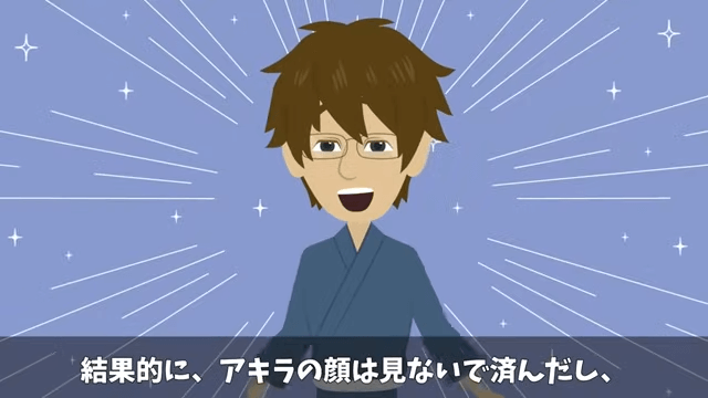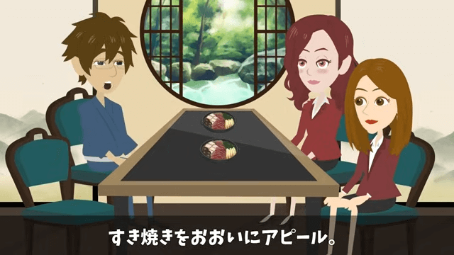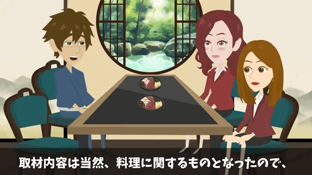主人公は料亭を代表して取材を受け、看板メニューのすき焼きをアピールします。 こうして主人公は、元同僚の顔を見ずに取材を終えました。