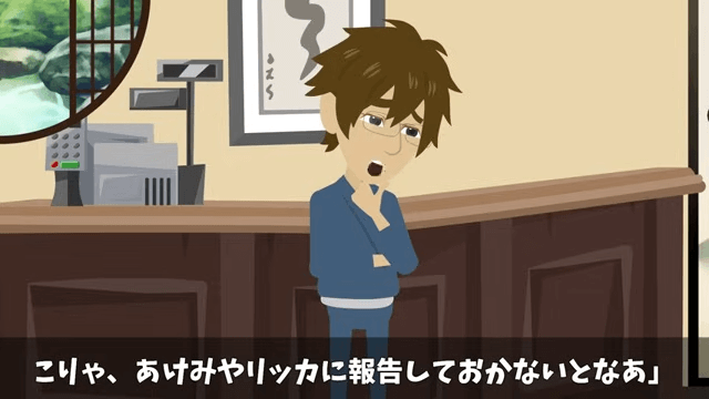 主人公は元同僚にテレビ局のお金について何か知らないかと尋ねました。 すると元同僚が猛スピードで料亭から逃げ去ったため、主人公はテレビ局の女性スタッフに報告することにしたのです。