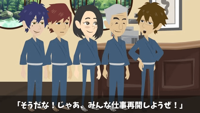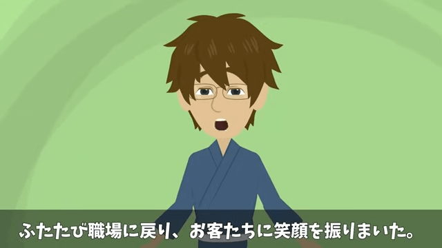 元同僚のことを他人事として捉え、呑気に語り合っていた主人公たち。 そして主人公は「じゃあ、みんな仕事再開しようぜ!」と言い、職場で客たちに笑顔を振りまくのでした。