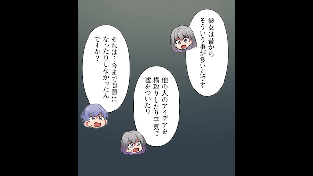 主人公の話を聞いた女性社員は「彼女は昔からそういうことが多いんです」と先輩が他人のアイデアを奪う常習犯だと教えてくれて…。