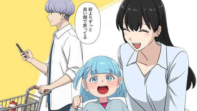 その後、スーパーで子どもと一緒に笑う先輩の笑顔を見た主人公は「前よりずっとよい顔で笑っている」とホッとするのでした。
