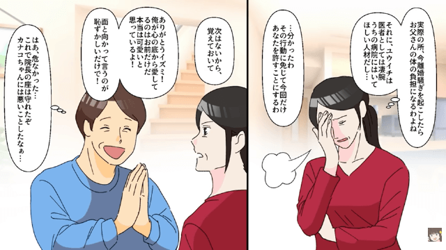 今回は『院長の座を私に奪われた夫「病院を退職する」⇒お望み通り離婚した結果』を紹介します。 夫と同じ病院で外科医として働く主人公は、院長を務めている父の体調を心配していました。 そんな中、夫は看護師と浮気をしており、主人公は夫と看護師の関係を父に話すことも検討していたのです。 すると次期院長の座を狙う夫は、主人公に「これは夫婦の問題だし…お義父さんを巻き込むのもよくないだろ?」と言ってきて…。