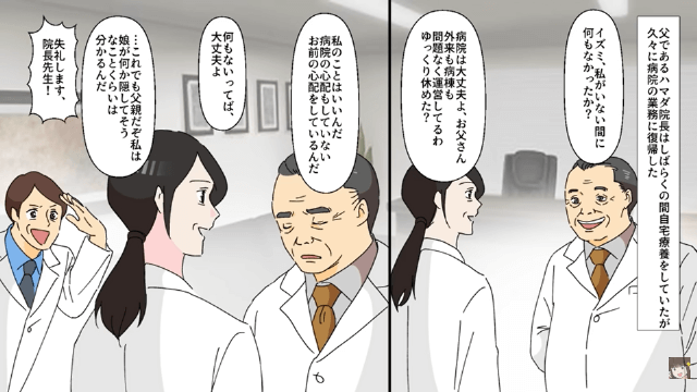 看護師は夫を奪いたい一心で主人公に宣戦布告をしましたが、夫は浮気相手である看護師よりも次期院長の座を守ることを優先し、主人公の味方をしました。 そんな中、自宅療養をしていた父が職場に復帰し、父は何やら主人公のことを心配していたのですが…。