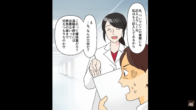 夫の浮気を知った父は夫を次期院長から外し、主人公を次の院長に指名しました。 すると主人公を逆恨みした夫が退職届を突きつけてきたのですが、主人公は夫に縋りつくことなく、離婚届を突きつけて…。