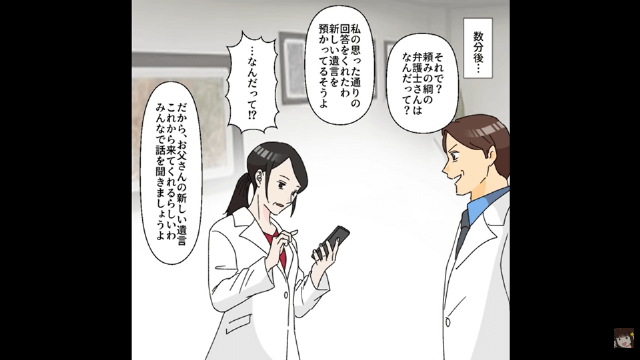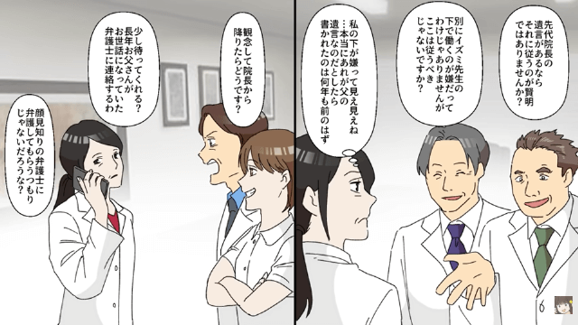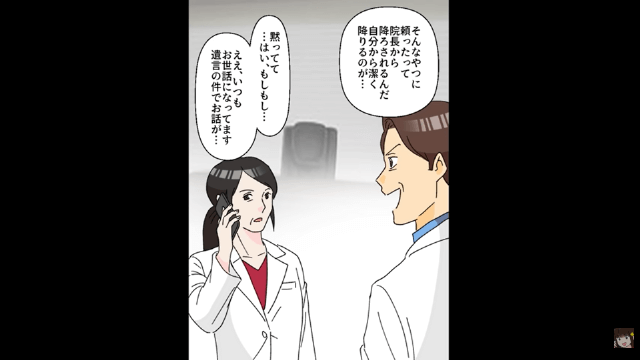 今回は『院長の座を私に奪われた夫「病院を退職する」⇒お望み通り離婚した結果』を紹介します。 父が亡くなると、夫は看護師と、主人公に反発している複数の医者を引き連れて主人公のいる院長室へやってきました。 そして夫は何年も前に父から渡された遺言書を取り出し、そこには院長の座を夫に譲ると書かれていると得意げに話し出したのです。