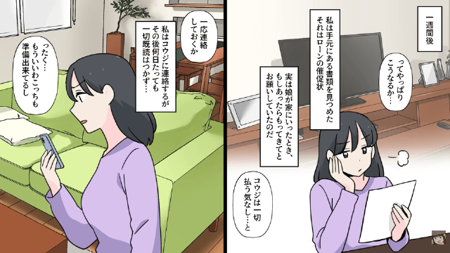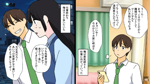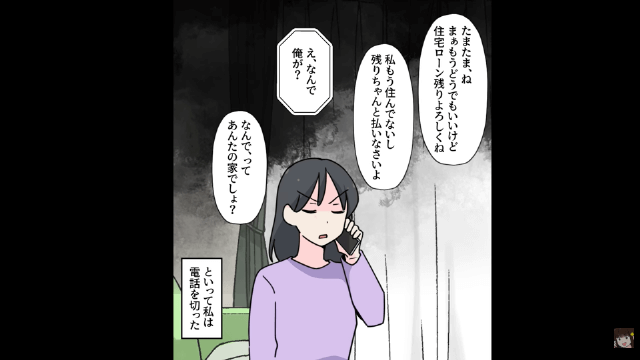 家を出た主人公は、浮気を否定し始めた夫の話を聞かずに「住宅ローン残りよろしくね」とだけ伝えました。 すると夫はこの先のことなど考えず家に浮気相手を連れ込み、主人公はその間に夫を追い詰める準備を進めていたのです。