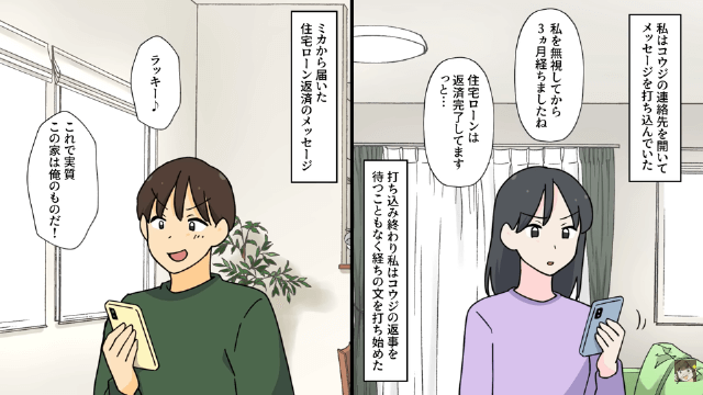 今回は『元夫が住宅ローンの連絡を無視した結果』を紹介します。 家を出た主人公は夫に残りの住宅ローンを支払うよう言いましたが、これまで住宅ローンのことを主人公に任せきりにしていた夫は支払い方法すらわからないようでした。 そして夫がのんきに浮気相手を連れ込んでいる間、主人公は夫を追い詰める準備を着々と進めていたのです。