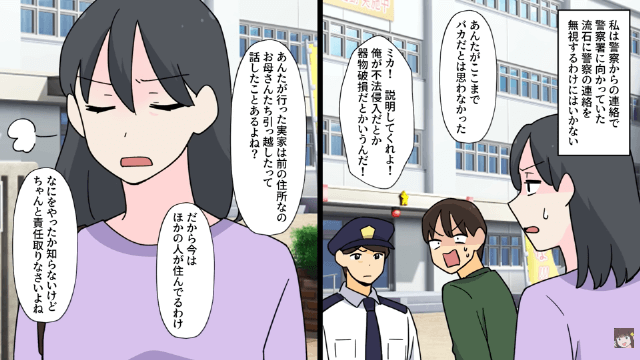 家を退去せざるを得なくなった夫と浮気相手は、主人公に泣きつこうと考え、すぐに主人公の実家へ向かいました。 しかし主人公の家族はすでに引っ越して、元の実家には別人が住んでいたため、夫は不審者として警察に捕まってしまったのです。