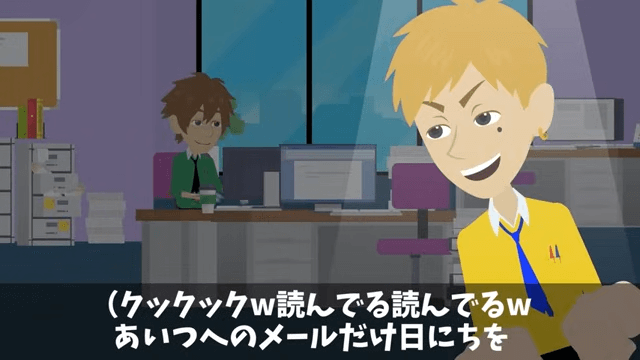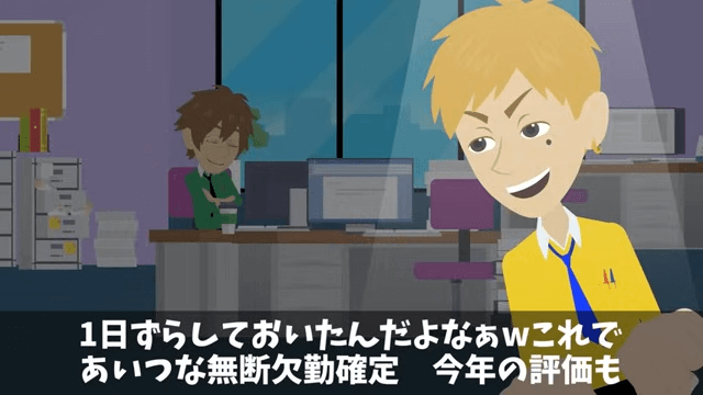 課長は主人公のメールだけ日にちを1日ずらしておきました。 そして課長は、これで主人公が無断欠勤確定だと喜びます。