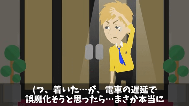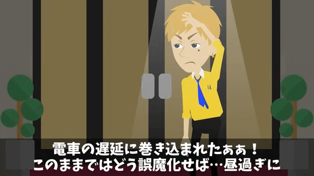 電車が遅延したと言ってごまかそうとしていた課長でしたが、本当に電車が遅延してしまいます。 そのため課長は「なんて言い訳をすればいいか…」と考え込みました。