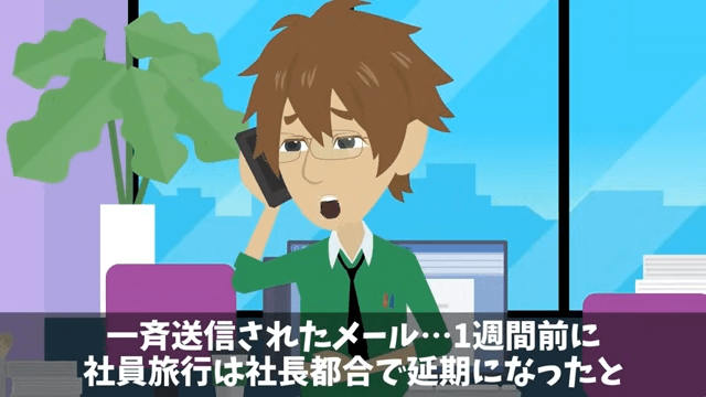 今回は『社員旅行の当日に上司から「旅行、本当は明日だから(笑)」とハブられた結果』を紹介します。 主人公が課長にメールについて尋ねると、課長は「社員旅行についてのメールは私がみんなに転送したじゃないか!」と言いました。 そこで主人公は、その後に経理の人からメールが来たことを課長に伝えて…。