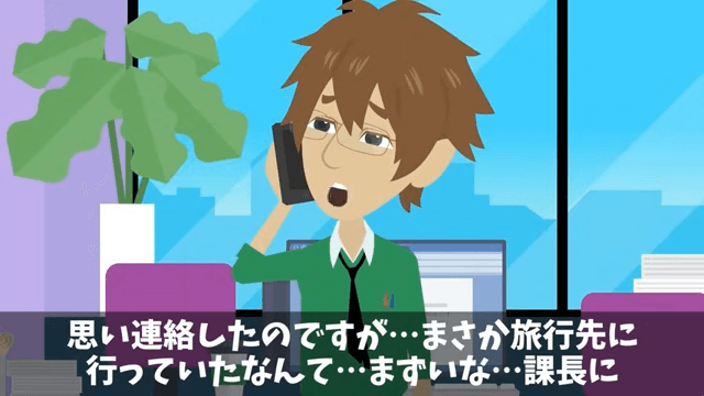 今回は『社員旅行の当日に上司から「旅行、本当は明日だから(笑)」とハブられた結果』を紹介します。 主人公が課長にメールについて尋ねると、課長は「社員旅行についてのメールは私がみんなに転送したじゃないか!」と言いました。 そこで主人公は、その後に経理の人からメールが来たことを課長に伝えて…。