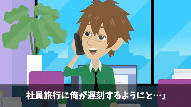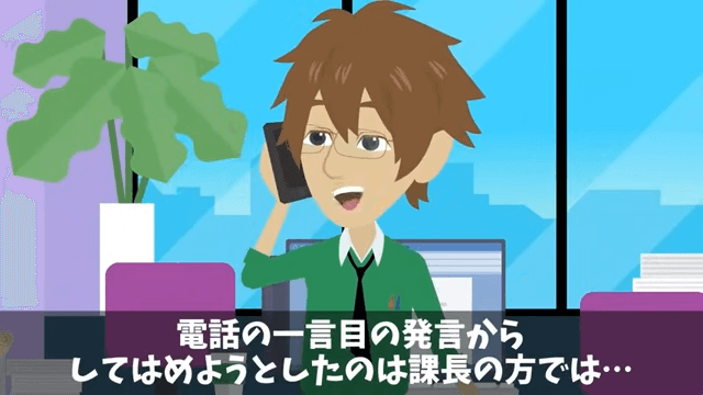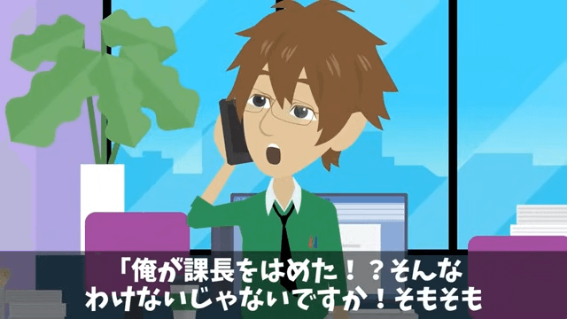 主人公は社員旅行がキャンセルになったことを課長に教えます。 それを聞いた課長は「何!?そんな話は知らん!お前!もしかしてまた俺をはめたのか!」と言いました。