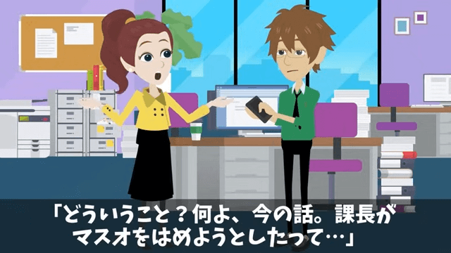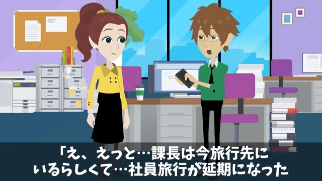 今回は『社員旅行の当日に上司から「旅行、本当は明日だから(笑)」とハブられた結果』を紹介します。 みんなが出社していることを知った課長は、また自分をはめたのかと主人公に言いました。 それに対し主人公は「はめようとしたのは課長のほうでは…」と言い返します。
