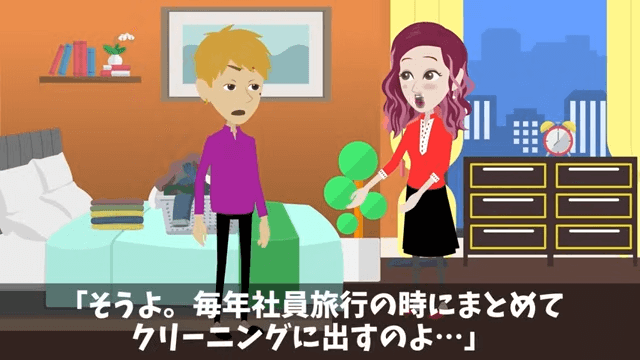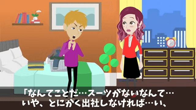 課長の妻はスーツをすべてクリーニングに出したと課長に伝えます。 それを知った課長は、仕方なくそのまま私服で出社することにしました。