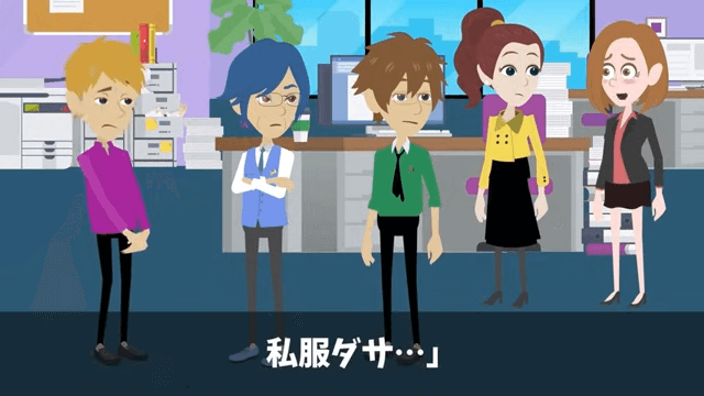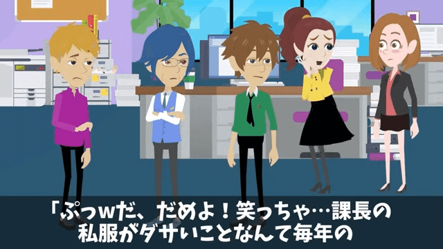 ようやく出社した課長に、女性社員は「課長…遅刻した上に私服って…」と言います。 さらにもう1人の女性社員は課長の私服がダサいと言いました。