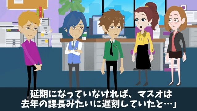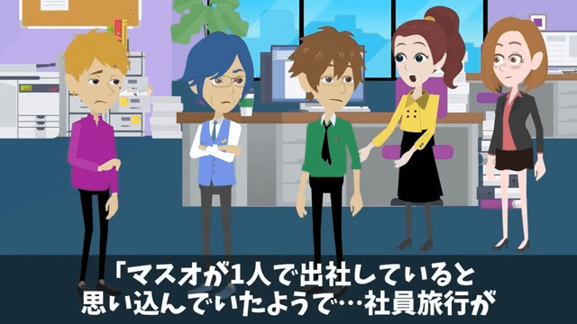 女性社員は、課長が主人公1人が出社していると思い込んでいたことを説明します。 そして、社員旅行が延期になっていなければ、主人公が去年の課長のように遅刻していただろうと言いました。