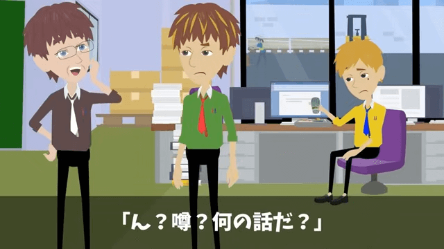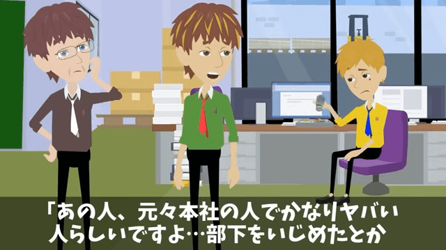同僚が課長と話をしていると、もう1人の同僚が「ちょ、ちょっとちょっと…知らないんですか…あいつの噂…」と言いました。 そして同僚は、課長が本社で部下に嫌がらせをしていた厄介者であることを説明します。