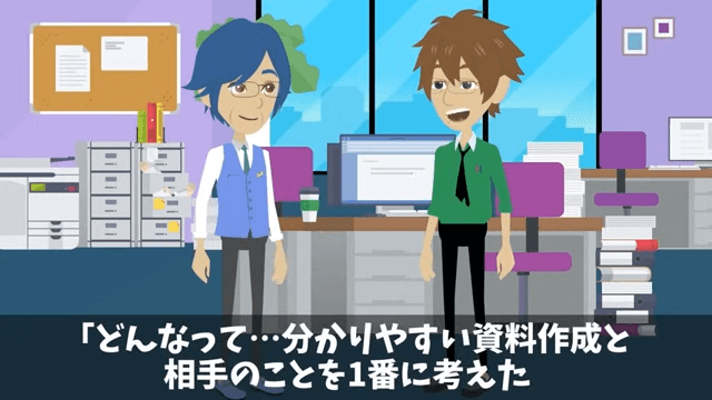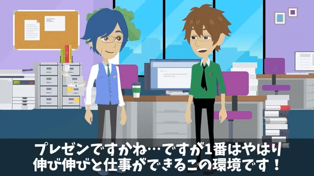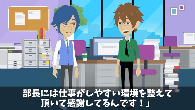 部長は契約を決めた主人公に「どんな手法を使って取引先を落としたんだ?」と尋ねます。 それに対し主人公は「1番はやはり伸び伸びと仕事ができるこの環境です!」と答えました。