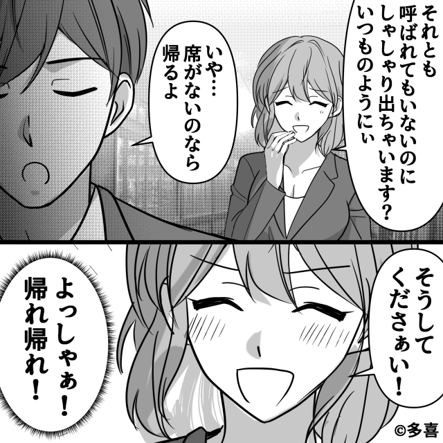 会食当日、部長から詳細を聞いていた主人公は老舗高級料亭にやってきます。 しかし後輩に「先輩の席はないですよ〜?」とニヤニヤと言われ、主人公は呆れて帰ることにしたのでした。