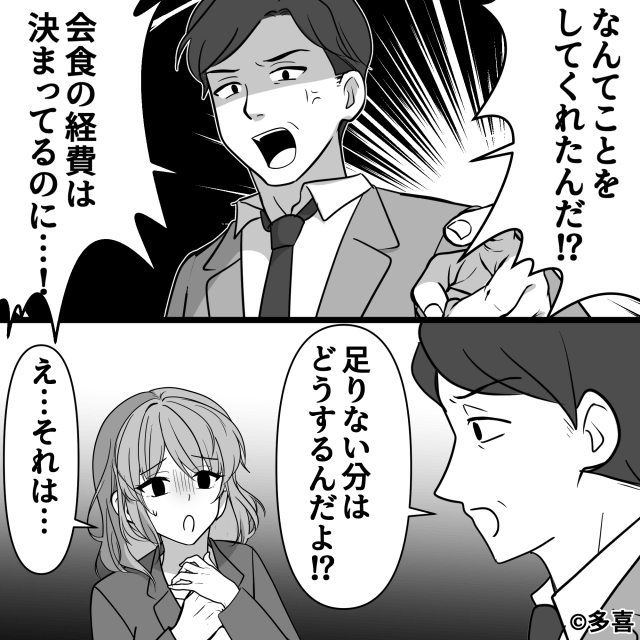 いつもは主人公の紹介だったため特別価格で食事ができていたことを知って、焦り始める後輩。 部長に責められ、後輩は「みんなあの人を持ち上げていますが、私にはわかりません!」と反抗して…。