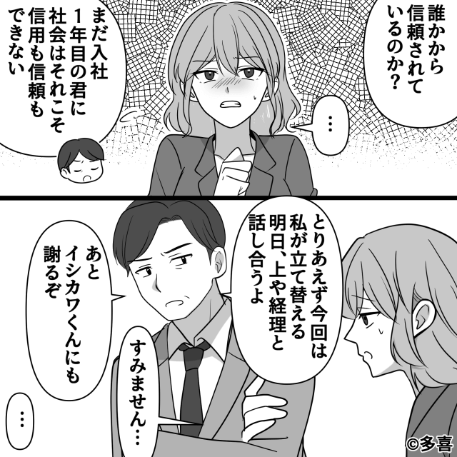 今回は『“高卒の上司”をナメた新人の末路』を紹介します。 主人公を追い出した結果、いつもの特別価格で食事をすることができず、部長に責められた後輩。 しかし後輩は「みんなあの人を持ち上げていますが、私にはわかりません!」と理解していないようで…。