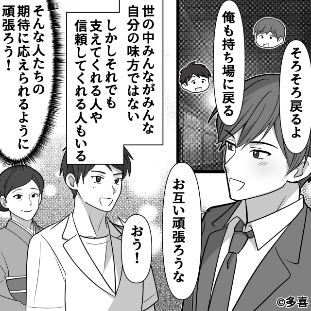 後輩は田舎の支社に左遷され、自分の行動を後悔します。 一方、主人公は支えてくれる人や信頼してくれる人のために頑張ろうと、改めて決意するのでした。
