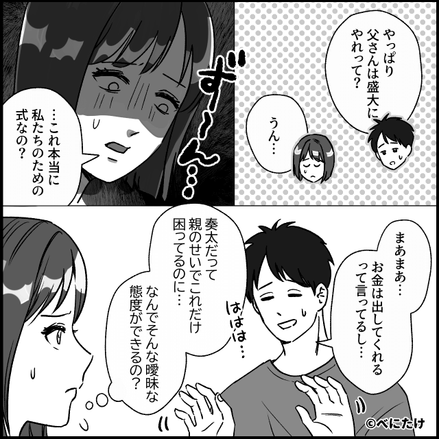 そんななか義両親の言いなりになっている夫に、主人公はモヤモヤとするのでした。