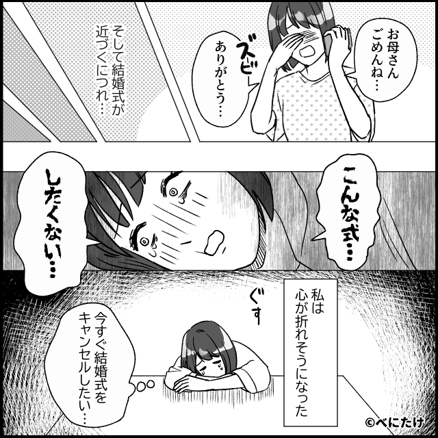 借金をした母を涙ながらに責める主人公ですが、母の「一生に1度の可愛い娘の結婚式だもの…」という言葉を聞き、主人公は母に感謝をします。 しかし結婚式が近づくにつれ「こんな式…したくない…」と主人公は心が折れそうになり…。
