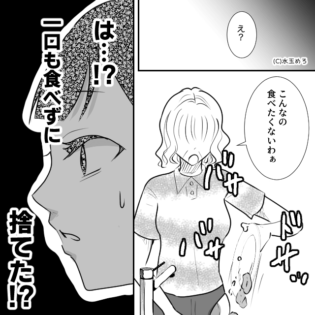 同居初日から義母に嫁いびりをされ、限界を感じていた主人公。 ある日は主人公が作った食事を義母に捨てられ、主人公はショックを受けます。