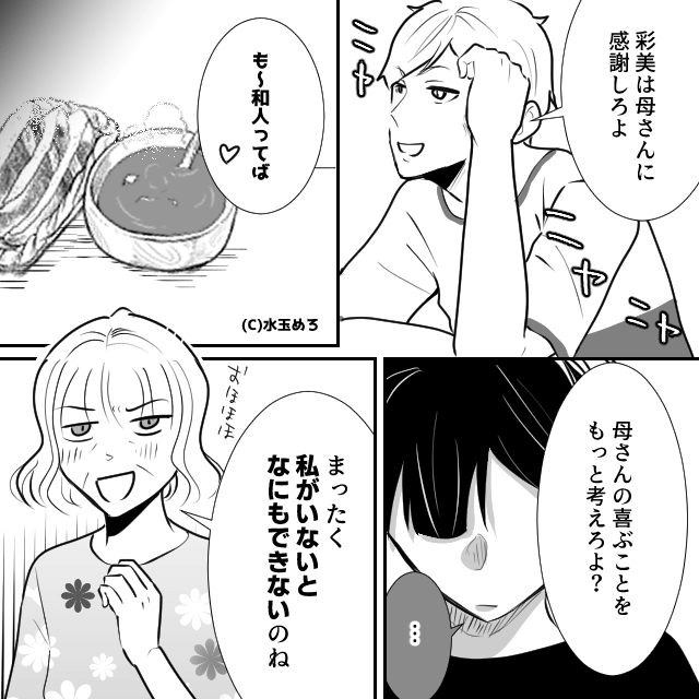 ある日の夜、いつもよりひどい嫁いびりをしてきた義母にうんざりしていた主人公。 夫が義母を褒めると義母は調子に乗り「私がいないとなにもできないのね」と主人公につっかかってきます。