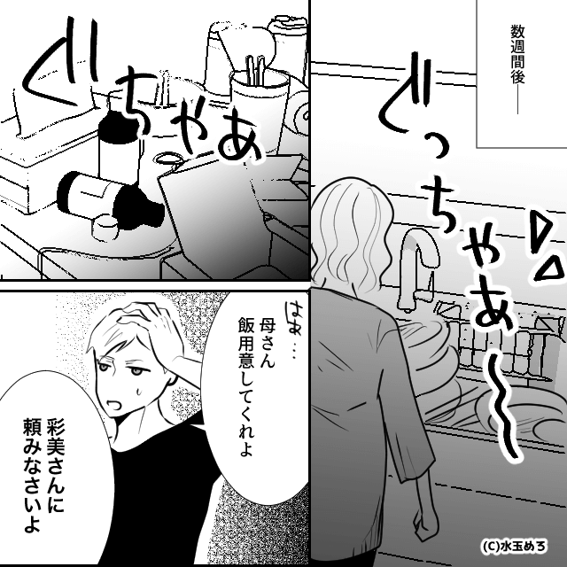 すると数週間後、主人公が家事をしなくなったことで家は荒れ、義母は生活費の支払いで苦しい思いをして、夫と義母は絶望するのでした。